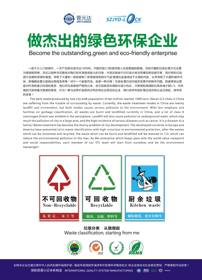 并在企業(yè)內(nèi)部進(jìn)行垃圾分類培訓(xùn)和宣傳,我們將垃圾進(jìn)行分類處理以減少對環(huán)境的污染!