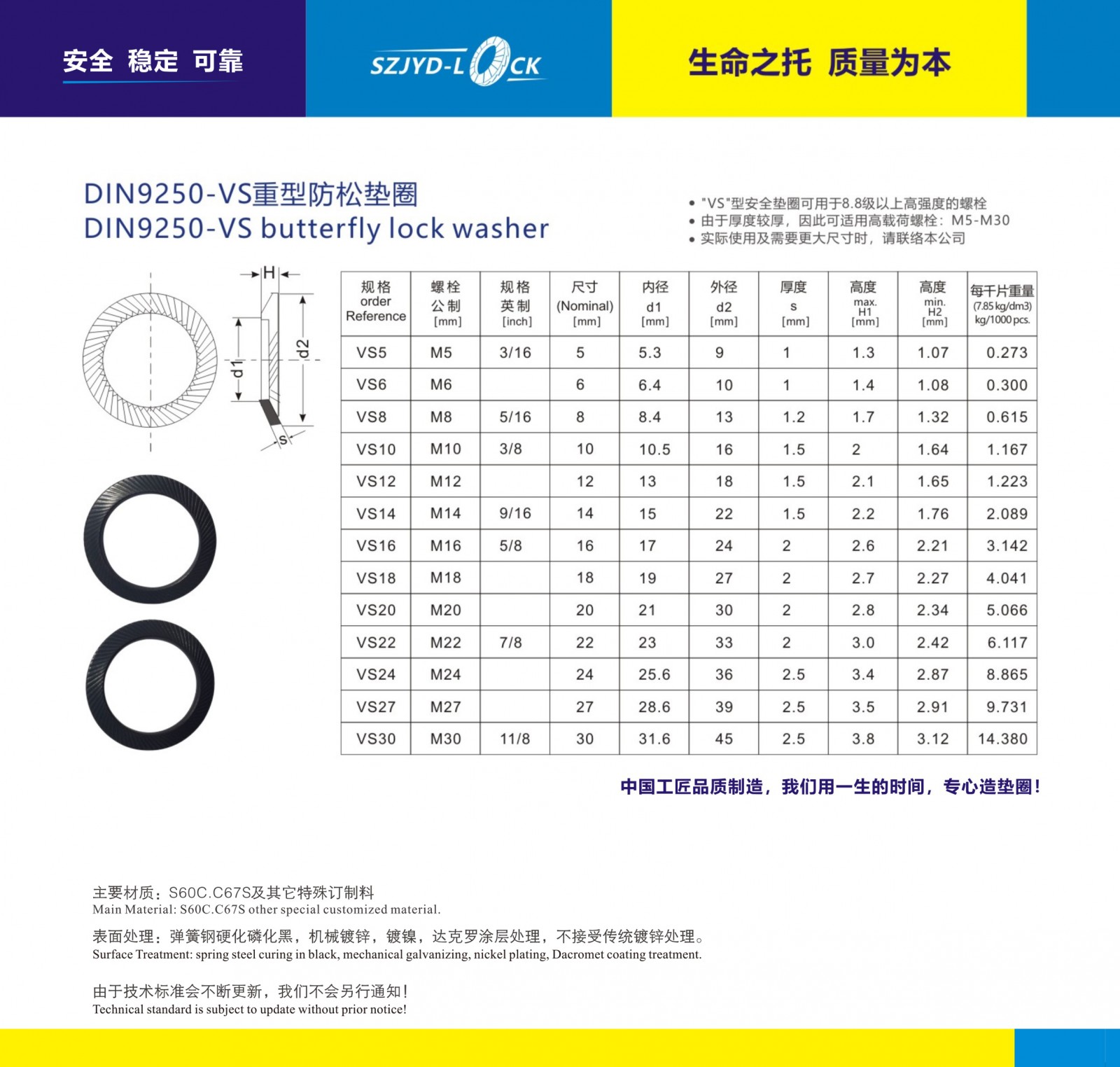 DIN9250防松墊圈、執行德國標準、按螺栓的使用條件分為兩類:8.8級以下螺栓均選用S輕型安全防松墊圈、10.9級以上螺栓均先用VS重型安全墊圈系列、