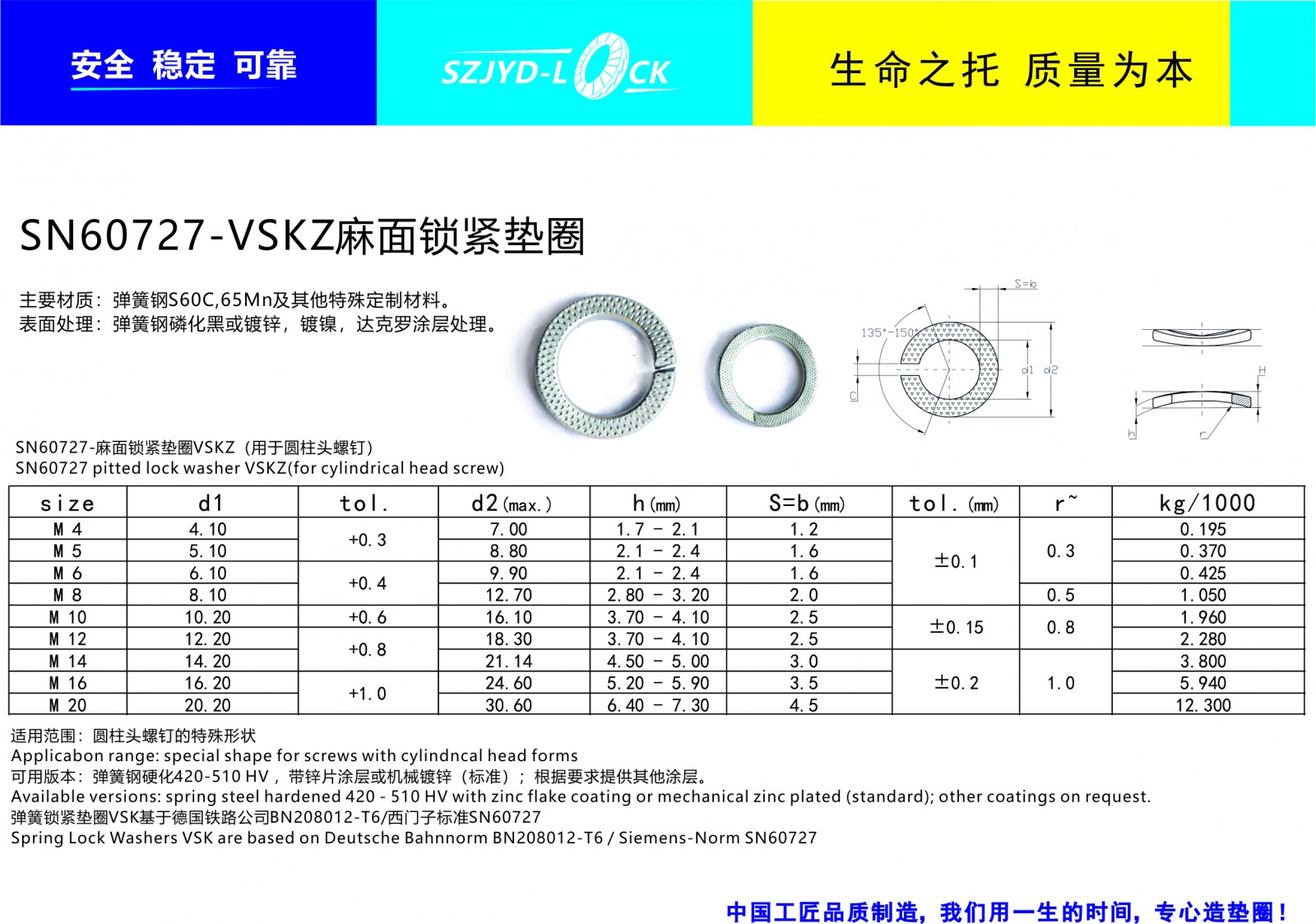 SN60727-VSKZ 麻面墊圈由西門子軌道交通公司設計制定、基于張力摩擦的構造原理。鞍形墊圈表面麻面花紋與螺栓鎖緊面接觸,增大的鎖緊力起到了明顯防松功能!VSKZ標準窄型麻面墊圈適用于較小安裝空間!