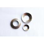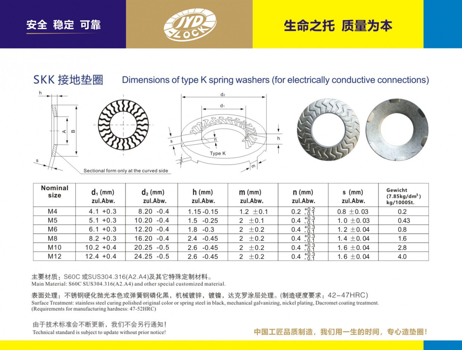 SKK標準接地墊圈、該墊圈是一款法式鎖緊墊圈的改良設計產品、表面條紋有預緊防松作用。墊圈的背面設計有六個爪形剌破角!主要功能是在配合螺栓螺釘擰緊時可以剌破金屬基體表面!主要功能是剌破作用、因此也有人叫剌破墊圈、帶爪觸地墊圈!