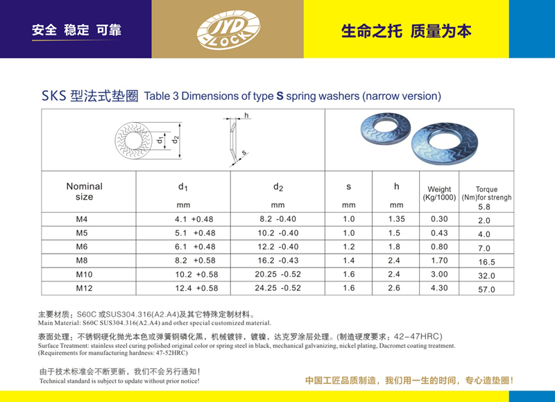執行標準:按SKS鎖緊墊圈制造規格:M4-M30為標準型號 也可按要求求提供訂制。主要鋼質:SUS304.316、A2.A4及超級不銹鋼等 硬化等級:HV350 符合10