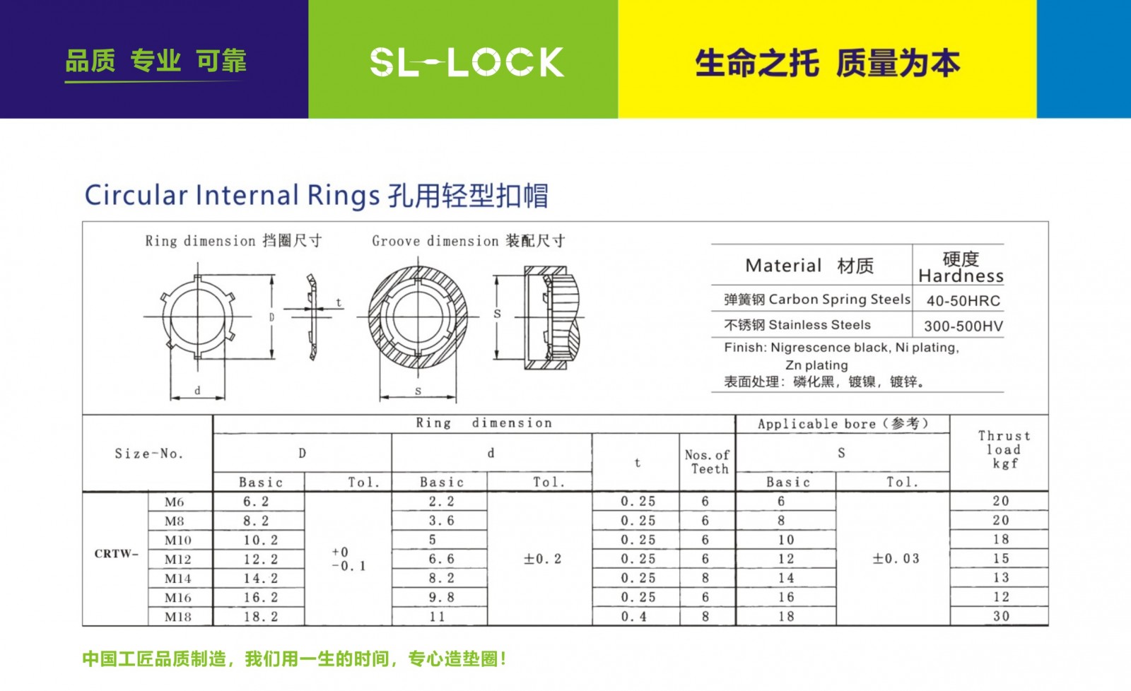 名稱:輕型孔用止動墊圈 執(zhí)行標準:CRTW 型號:M6-M18 材質(zhì):65MN/C67S 表面處理:磷化黑色