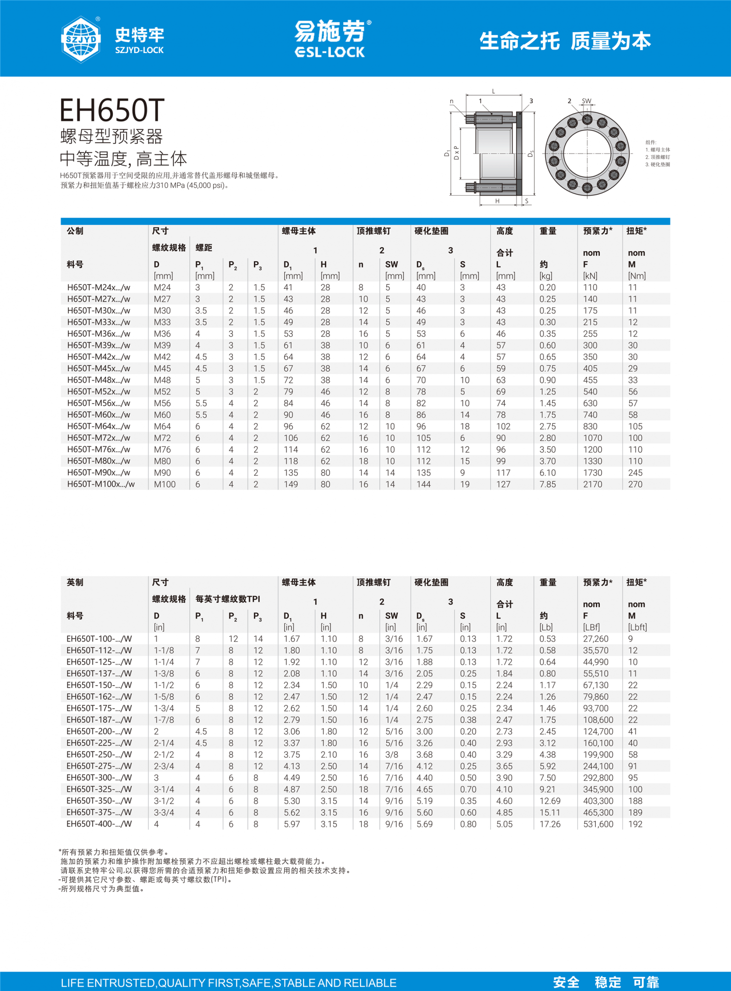 多頂推超級(jí)預(yù)緊器,可在很小空間安裝,使用簡(jiǎn)單工具即可輕松預(yù)緊,節(jié)省安裝時(shí)間,ESL-LOCK品牌易施勞超級(jí)螺母具有完全的防松鎖緊功能,可多次拆卸重復(fù)使用。特別適用于M24規(guī)格以上大型螺栓鎖緊!一擰永固,永不松動(dòng)!使用常規(guī)格為合金材料及特殊不銹鋼合金材料以及鎳基合金材料!更多了解歡迎咨詢(xún)我們.....